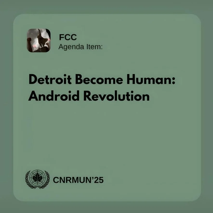 The Fictional Crisis Committee must navigate shifting alliances, cyber warfare, and rebellion in the streets. Will the Android Revolution spark a new age of equality, or bring about the fall of humanity?
